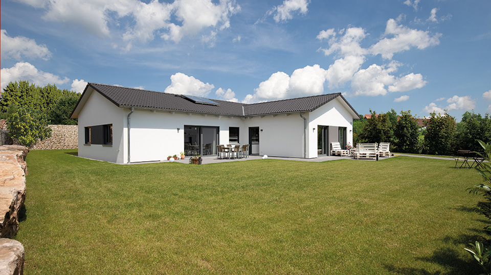 „Die Vorschlagsgrundrisse von Hanse Haus waren sehr hilfreich für uns. Wir konnten uns viele Inspirationen holen, jedoch auch unsere eigenen Ideen einbringen. Das Ergebnis kann sich sehen lassen: ein schicker Winkelbungalow mit einem flachen Satteldach und einer Dachneigung von 20 Grad.“