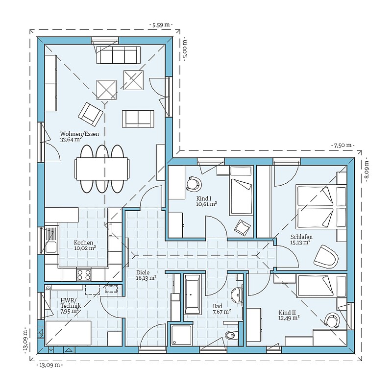 Auf den insgesamt 113 m² Wohnfläche ist bei diesem Bungalow viel Raum für eine vierköpfige Familie. Während der Wohn-, Ess- und Kochbereich in dem einen Gebäudeflügel liegt, sind das Elternschlafzimmer und die beiden Kinderzimmer im anderen Flügel untergebracht. So ist trotz der Anordnung aller Räume auf einer Ebene eine räumliche Trennung der unterschiedlichen Bereiche möglich.