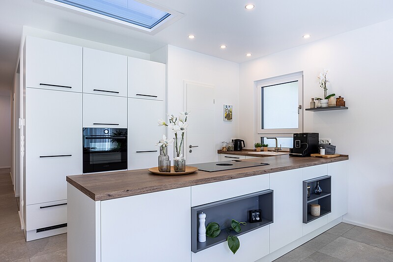 Ausserdem betritt man von dort aus auch die grössere Hauptwohnung. Die durchdachte Raumaufteilung sorgt dafür, dass auf 111 Quadratmetern sogar ein zusätzliches Arbeits- oder Gästezimmer, eine praktische Speisekammer und ein Ankleideraum Platz finden. Der breite Flur, der grossszügig geschnittene Wohn- und Essbereich und das geräumige Bad bieten viel Freiraum und damit ideale Voraussetzungen für barrierefreies Wohnen.