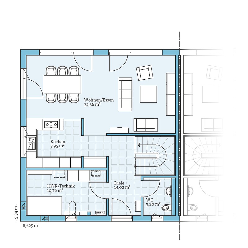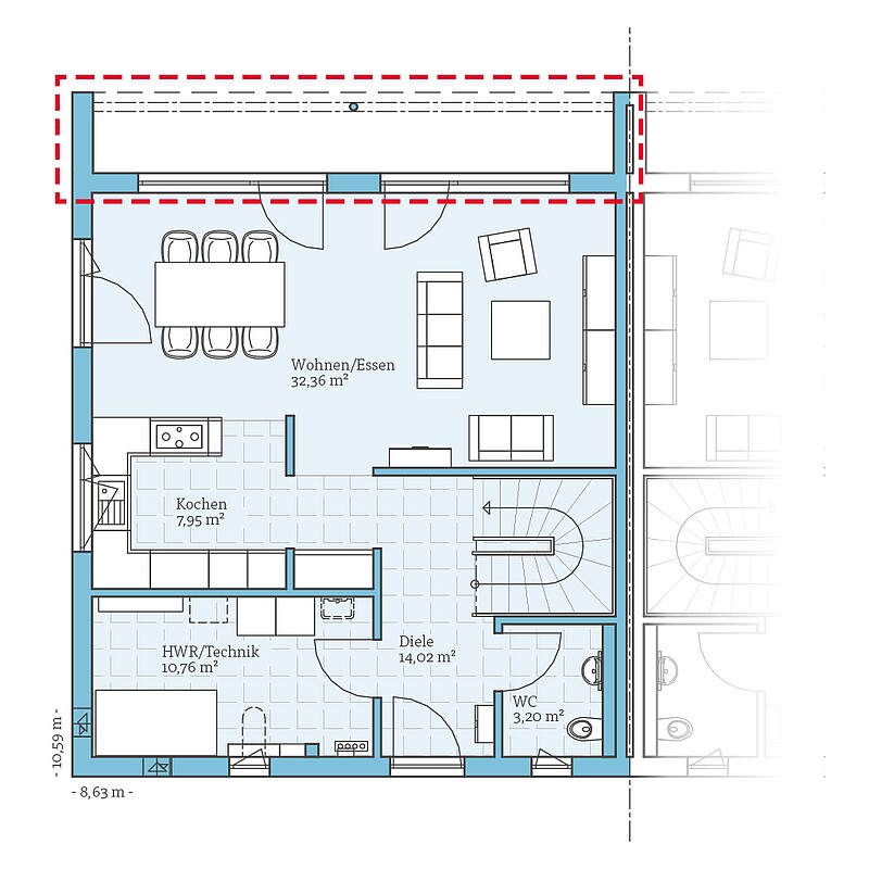 Die offene und sehr grosszügige Gestaltung des Wohn- und Kochbereichs vermittelt eine angenehme, leichte Wohnatmosphäre. Eine Nische vor der Küche bietet sich als Stauraum an. Auf Bodenplatte kann zum Beispiel der Platz unter der Treppe ebenfalls zum Abstellraum ausgebaut werden. Der Weg ins Obergeschoss führt über eine halbgewendelte Treppe. Neben den beiden Kinderzimmern befinden sich dort auch das
