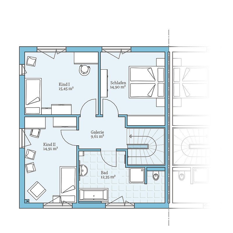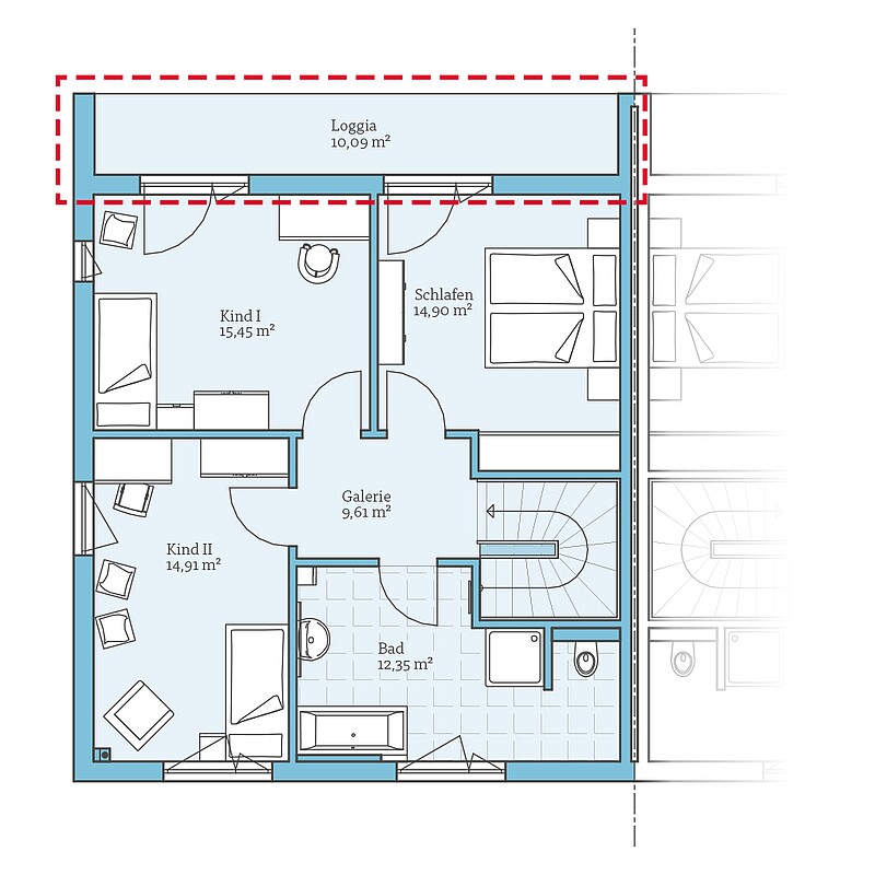 Elternschlafzimmer und das Familienbad. Auf Wunsch lässt sich das Obergeschoss um eine überdachte Loggia erweitern, die gleichzeitig die darunterliegende Terrasse vor Regen schützt.