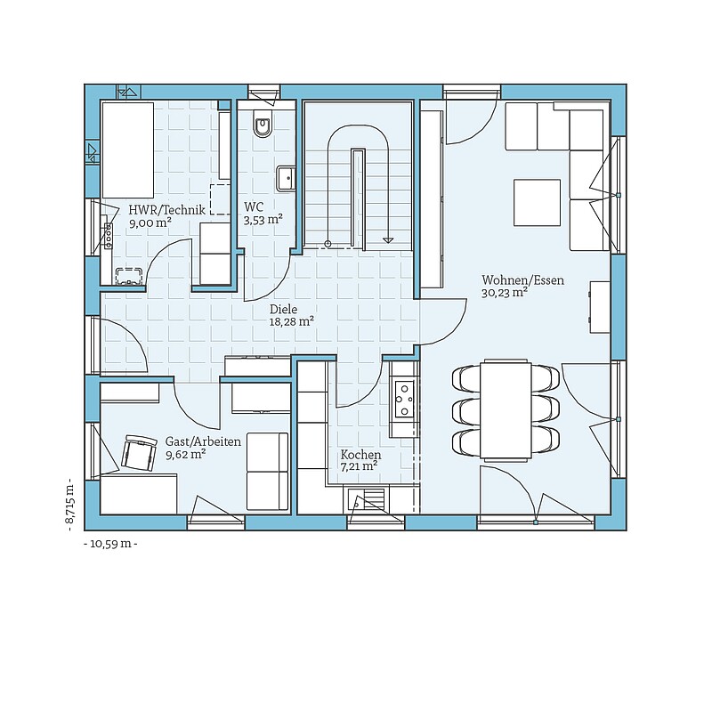 Die Aussenmasse sind zwar verkürzt, auf die Grössen der einzelnen Räume hat dies jedoch nur wenig Einfluss. Und während der ein oder andere Quadratmeter Wohnfläche weniger im Alltag kaum auffällt, schont die Umplanung das Baubudget spürbar und passt sich auch kleineren Grundstücken besser an.