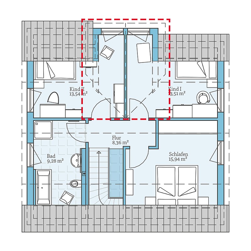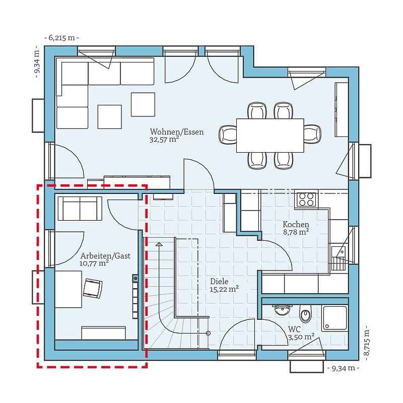 Durch die offene Gestaltung des Grundrisses wirkt gerade das Erdgeschoss trotz der kompakten Aussenmasse wesentlich grösser. Auch auf einen praktischen Hauswirtschaftsraum und ein separates Gäste-WC müssen Sie nicht verzichten.