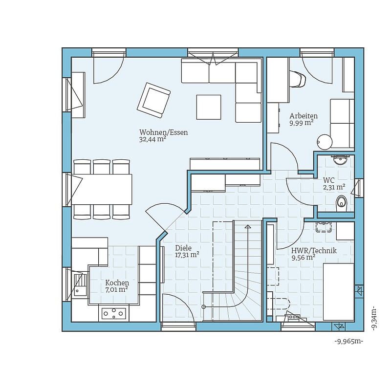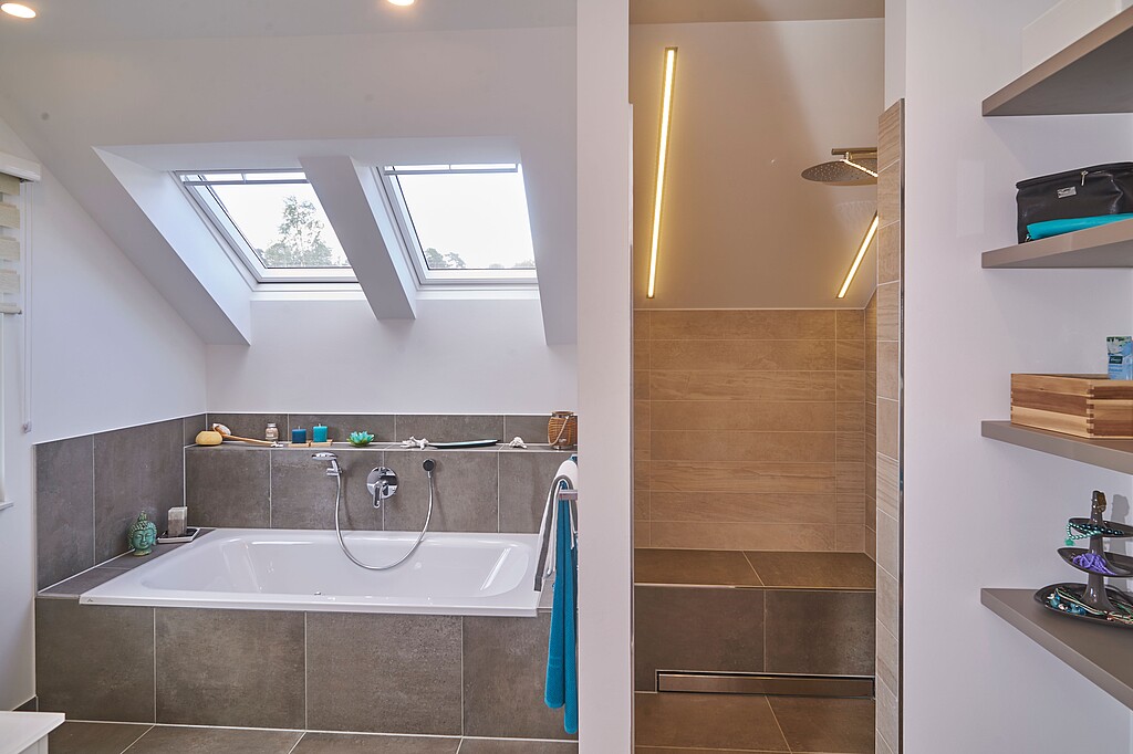 Das zusätzliche Arbeits- und Gästezimmer im Erdgeschoss kann bei Bedarf als drittes Kinderzimmer genutzt werden. Besonders praktisch: In das angrenzende Gäste-WC lässt sich sogar noch eine Dusche integrieren. Ideal für Teenager, die schon mal gerne länger das Bad blockieren.
