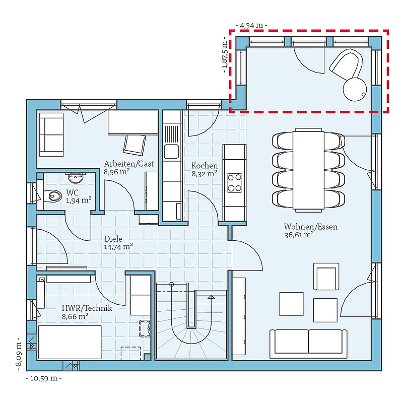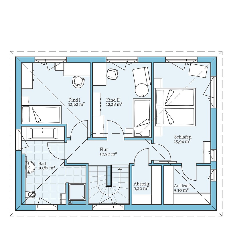 Die clevere Planung der Villa 142 macht es möglich, dass auf 142 m² nicht nur komfortable Wohnräume und ein eigenes Zimmer für jedes Familienmitglied zur Verfügung stehen, sondern darüber hinaus auch ein grosses Ankleidezimmer für die Eltern und ein Arbeits- oder Gästezimmer Platz finden.