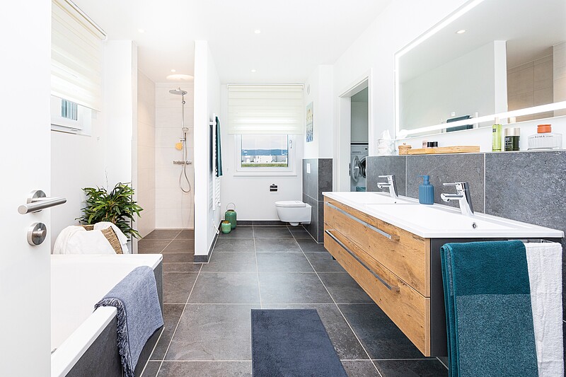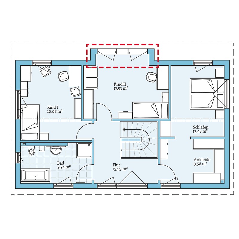 So finden beim Entwurf Vita 156 z. B. im Obergeschoss neben dem Elternschlafzimmer auch noch zwei Kinderzimmer, ein Bad und ein Ankleidezimmer für die Eltern Platz.