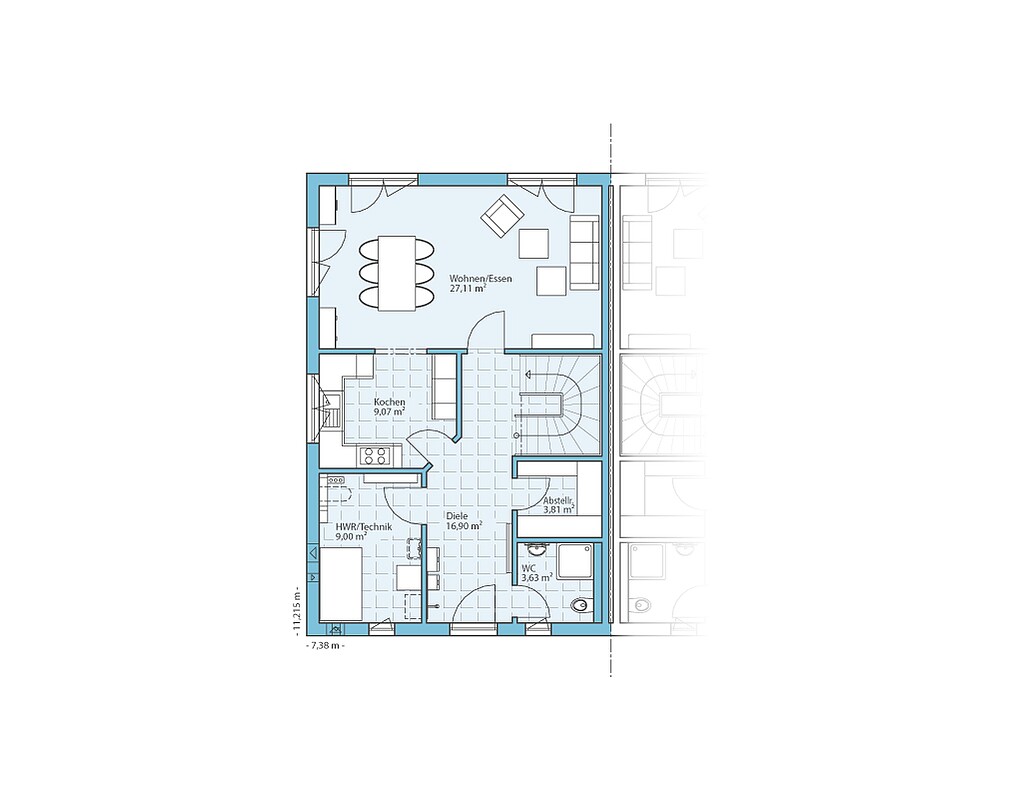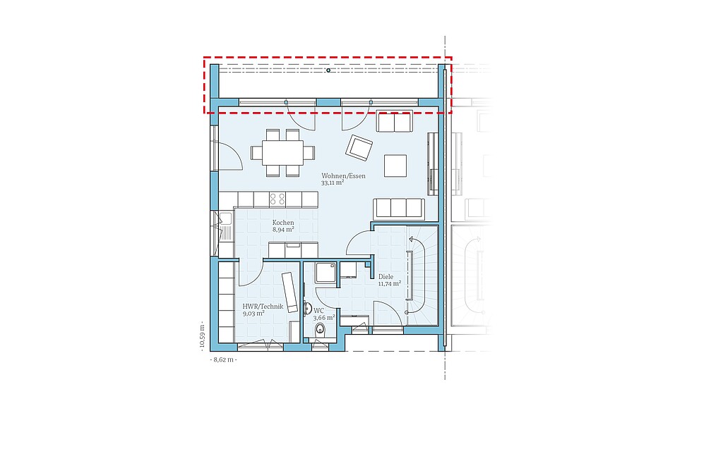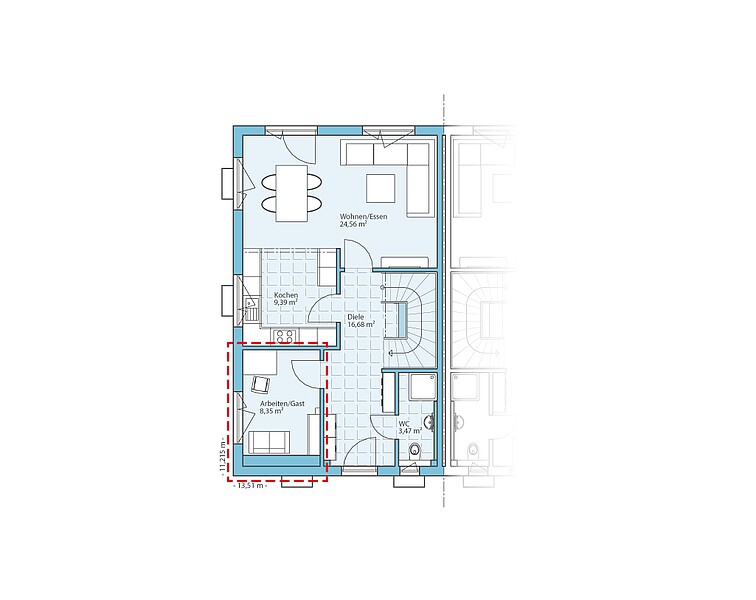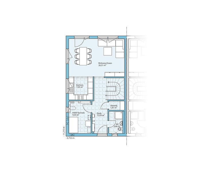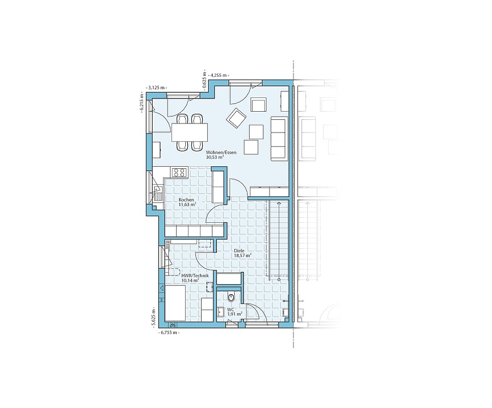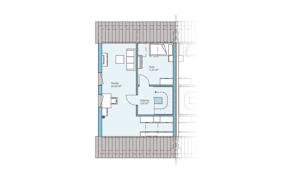 - Eine der vier Aussenwände ist fensterlos. Hier werden vorzugsweise Eingangsbereich, Treppen, Abstellräume oder die Toilette untergebracht.