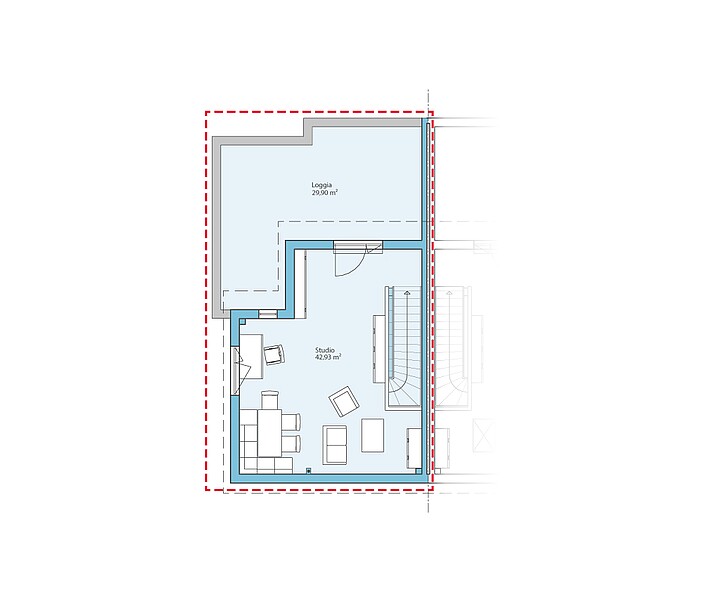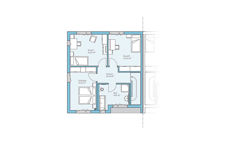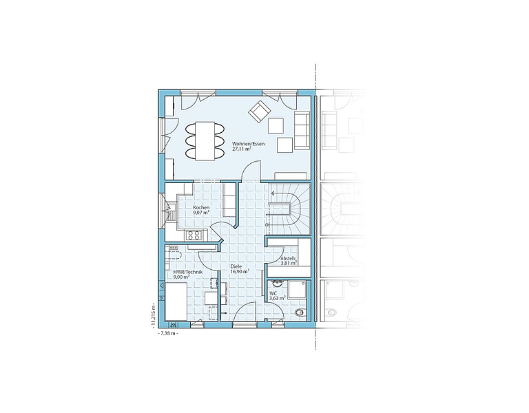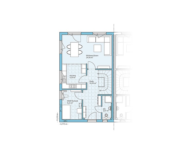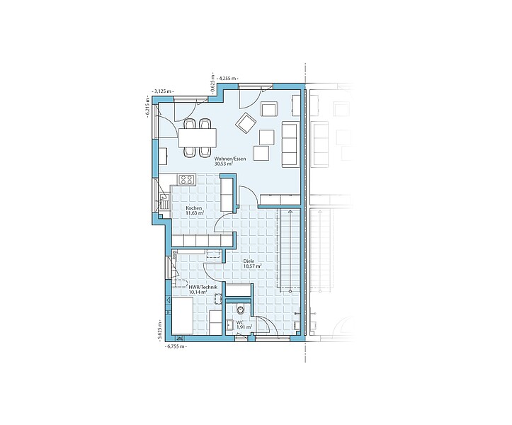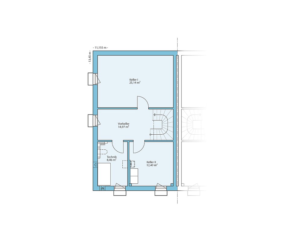 - Eine der vier Aussenwände ist fensterlos. Hier werden vorzugsweise Eingangsbereich, Treppen, Abstellräume oder die Toilette untergebracht.