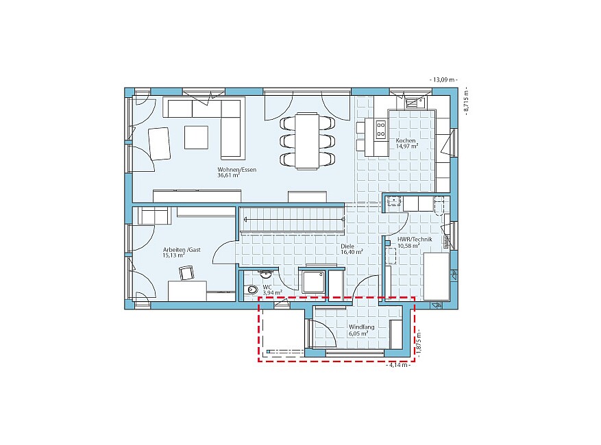 Eine Lösung, mehr Wohnraum im Haus zu schaffen, ohne dieses gleich über zwei Stockwerke zu vergrössern, kann die Ausgliederung des Technik- bzw. Abstellraumes in einen eingeschossigen Anbau, in einen Windfang oder in die Garage sein.