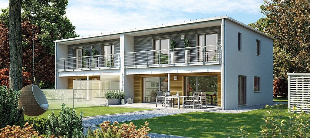 Beim Entwurf Doppelhaus 135 schützt eine überdachte Loggia im Obergeschoss die Terrasse im Erdgeschoss vor Regen.