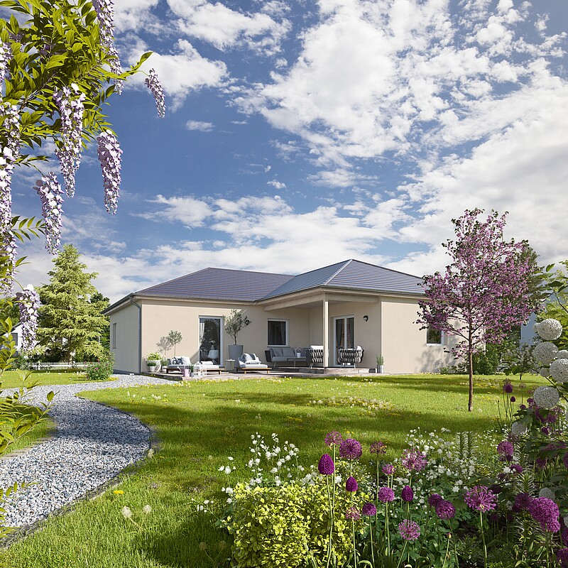 Der Hanse Haus Bungalow 113 zum Beispiel, der als Winkelbungalow sozusagen „ums Eck“ gebaut ist, bietet einen vor Wind geschützten Terrassenbereich, der als Planungsoption mit einer Überdachung vom Frühling bis in den Herbst komfortabel genutzt werden kann.
