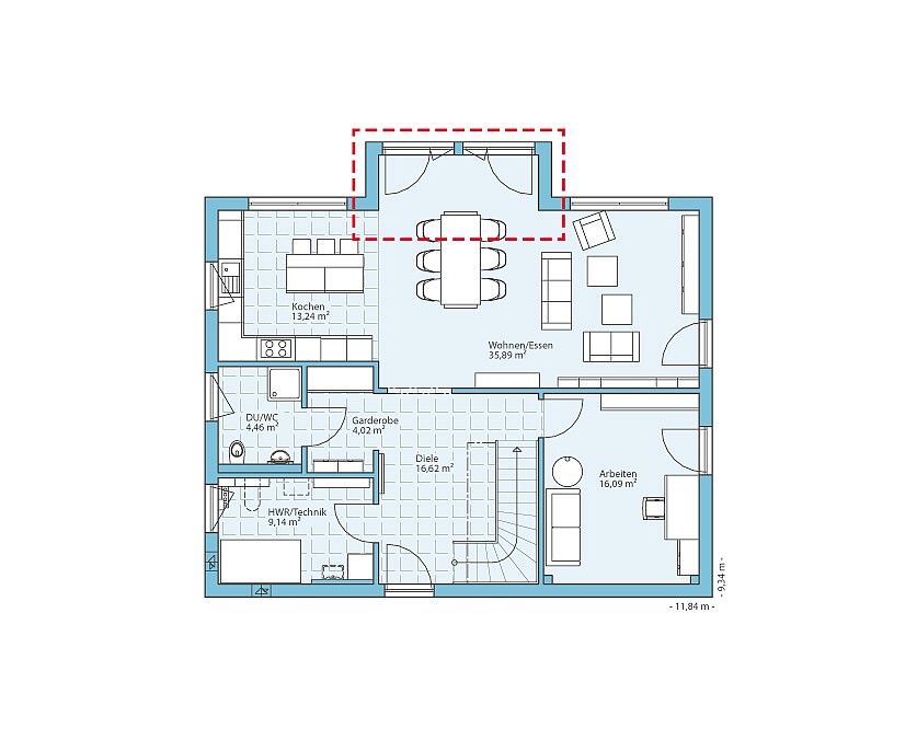 - Mit einem Windfang schaffen Sie darüber hinaus mehrere Quadratmeter zusätzlichen Raum für Garderobe, Schuhaufbewahrung, Schirme und Spielsachen, die sich oft im Eingangsbereich ansammeln.