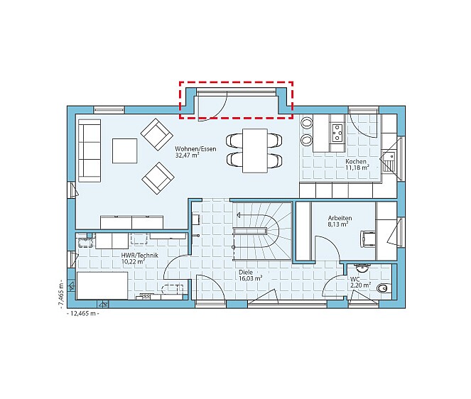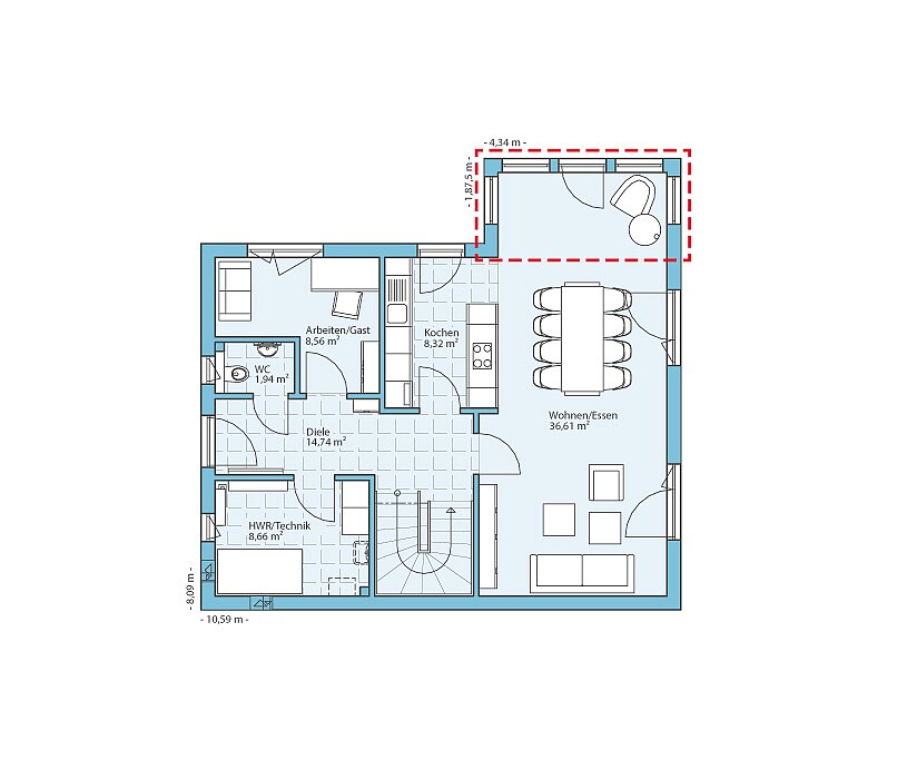 Viele unserer Bauherren wünschen sich die klassische Trennung: Wohnraum im Erdgeschoss, Privatbereich mit Schlafräumen im Obergeschoss. Möchte man im Erdgeschoss des Hauses neben Vorraum, Wohnraum, Küche und Speisekammer auch noch ein Gäste- oder Arbeitszimmer, eine Gästetoilette (eventuell mit Dusche) und den Haustechnikraum unterbringen, erfordert das eine bestimmte Hausgrösse und/oder eine ausgeklügelte Planung.
