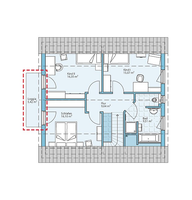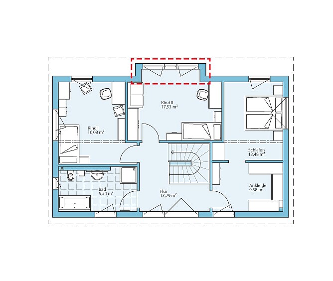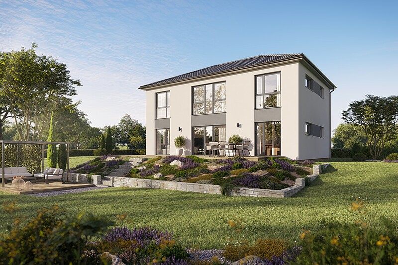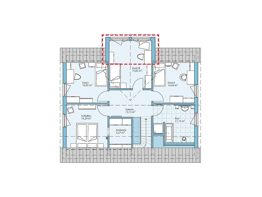 Sehen Sie sich als Beispiel unser Fertighaus Variant 45-175 an, bei dem der Zwerchgiebel im Dachgeschoss Raum für ein drittes Kinderzimmer schafft.