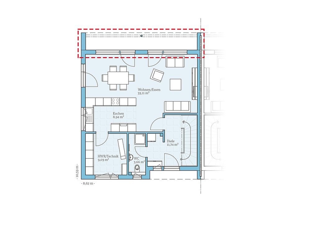 - Zusätzlicher überdachter Eingang ins Haus möglich