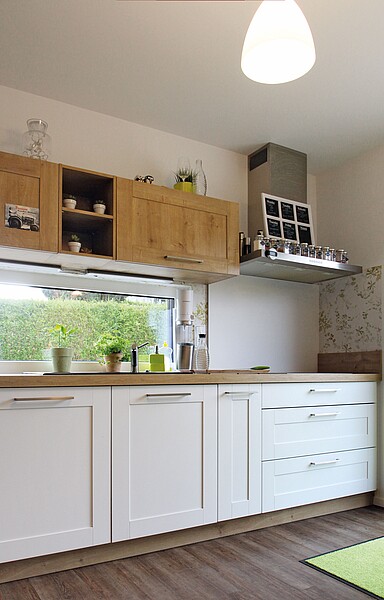 Entschieden haben sich die Bauherren für eine Kombination aus einer Gasbrennwerttherme, einer Lüftungsanlage und einer Solaranlage. Eine optimale Ergänzung dazu ist der Kaminofen im Wohnbereich, der zwar auch im tiefsten Winter für angenehme Wärme und eine schöne Stimmung sorgt, von den Bauherren jedoch so gerne genutzt wird, dass sie gleich das ganze Jahr über die Fußbodenheizung im Wohnbereich, dem Flur und der Küche quasi ausgeschaltet lassen können. Dank der Wärmerückgewinnung der Lüftungsanlage wird die Wärme des Kamins an die einströmende Frischluft zurück gegeben.