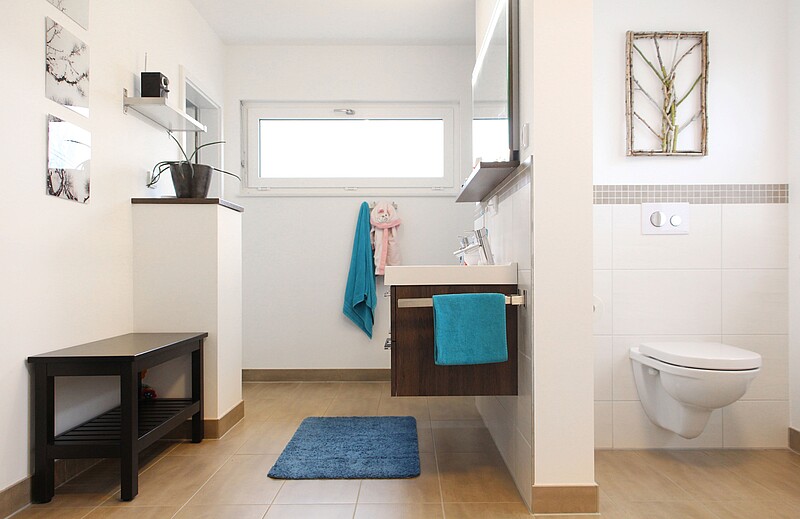 Durch das barrierefreie Gäste-WC mit Dusche im Erdgeschoss kann das jetzige Arbeitszimmer später einmal zum Schlafzimmer umfunktioniert werden. Dann ist Wohnen auf einer Ebene möglich – ganz ohne Treppensteigen. Das war heute nur ein geringer Aufwand, der später einmal unbezahlbar ist“, beschreibt Stefan Olschewski die Planungsoption fürs Alter.