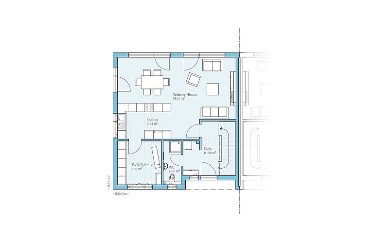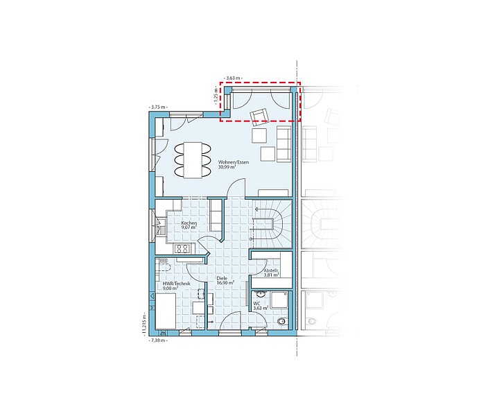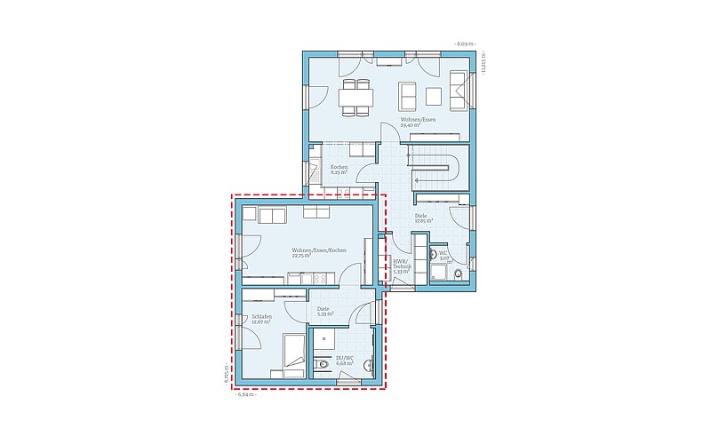 - Wenn eine Partei weniger Platz benötigt, bietet sich ein Haus mit Einliegerwohnung an. Der Grundriss lässt sich individuell an die Bedürfnisse und den Platzbedarf der Bewohner anpassen.