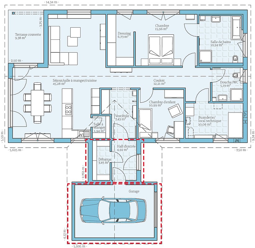 - L'option 1 peut être complétée par un garage. L'avantage : vous entrez dans la maison depuis le garage en passant par le vestibule.