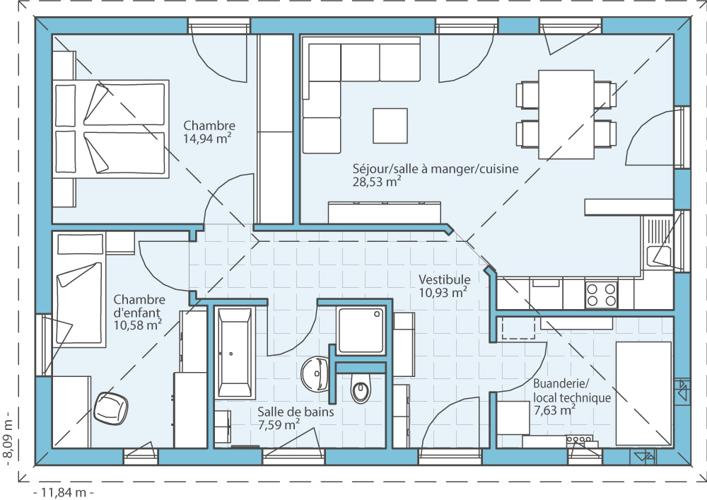 - Du fait du local technique/buanderie, le plan prévoit la possibilité de construire la maison sur une dalle de fondation. Si vous souhaitez ajouter une cave, le local technique deviendra la sortie de la cave.