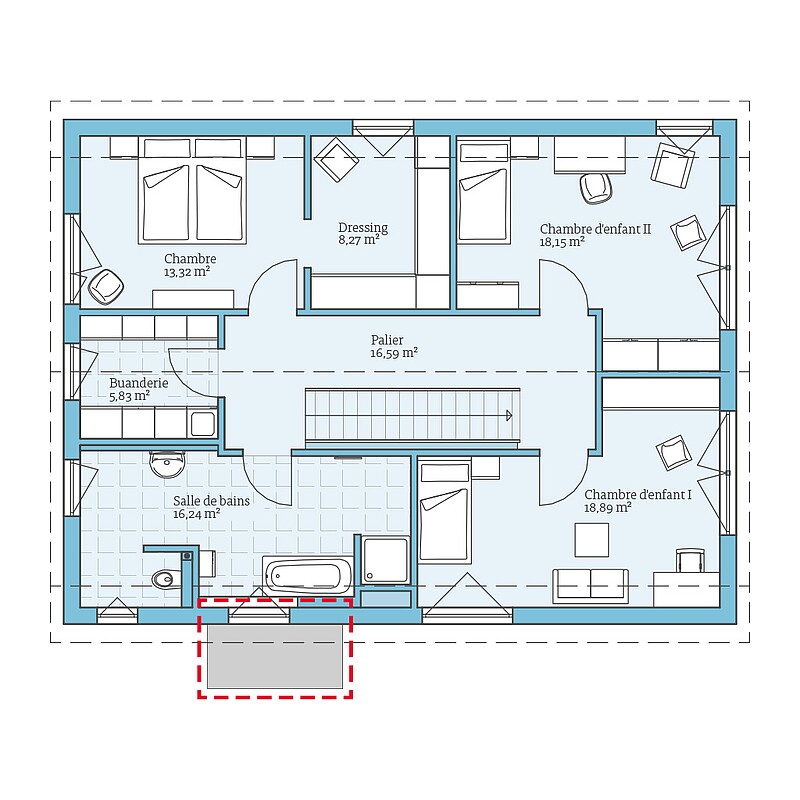 Les chambres du dernier étage comprennent une grande salle de bain bien-être avec baignoire et douche. Les chambres d'enfants sont également dimensionnées de sorte que ces derniers puissent se sentir à l'aise, jusqu'à l'adolescence dans leur nouvelle habitation. La buanderie se situe sous les combles: chose pratique puisque c'est également à cet endroit que le linge se trouve et est rangé. Grâce à cette configuration, un espace de rangement supplémentaire est libéré dans le local technique du rez-de-chaussée.