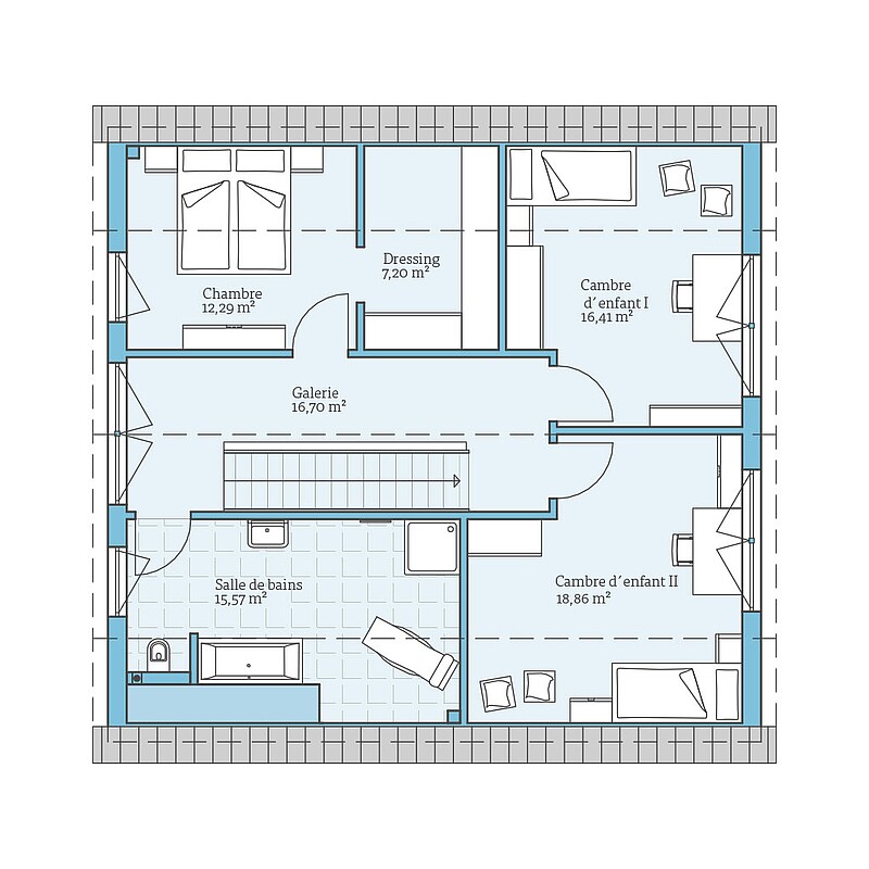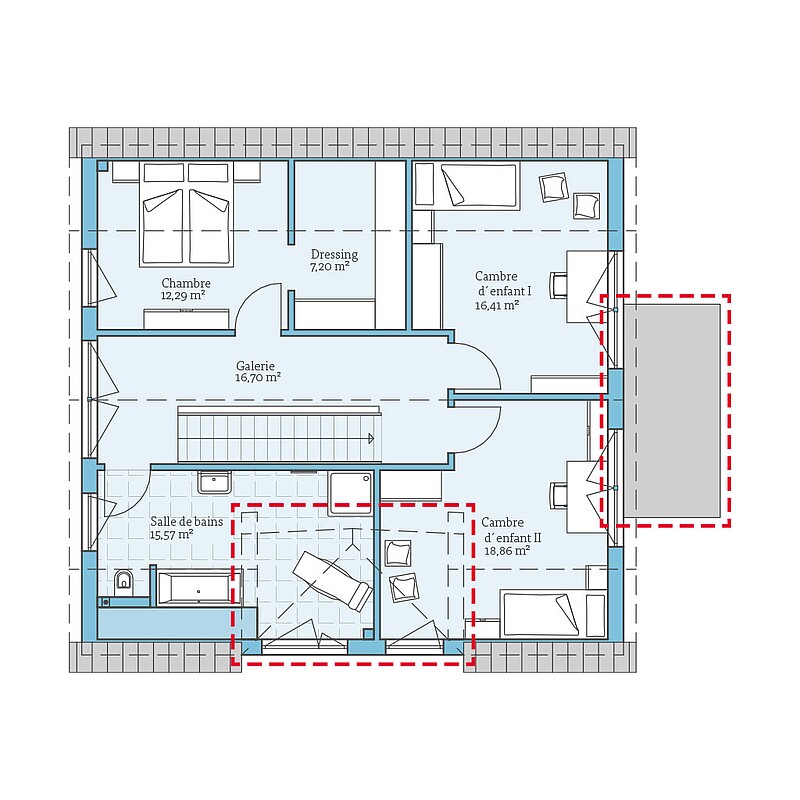 La grande salle de bains familiale dans les combles et l'une des deux chambres d'enfants spacieuses sont non seulement agrandies de 1,5 mètre carré, mais bénéficient en plus au maximum de la lumière du jour.