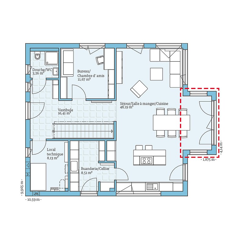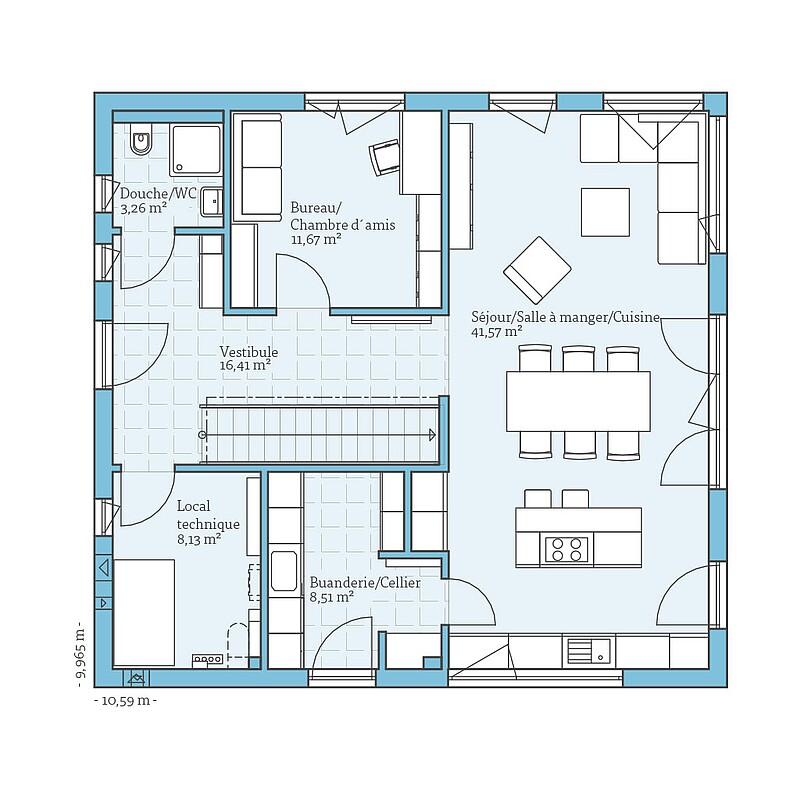 La caractéristique principale du rez-de-chaussée est l'espace ouvert du salon, de la salle à manger et de la cuisine. L'encorbellement optionnel avec de grandes baies vitrées y crée de l'espace pour un coin repas particulièrement lumineux et confortable. Très pratique: un espace supplémentaire, directement adjacent à la cuisine ouverte, abrite une combinaison de garde-manger et de buanderie. Ainsi, les trajets quotidiens dans la maison sont réduits.
