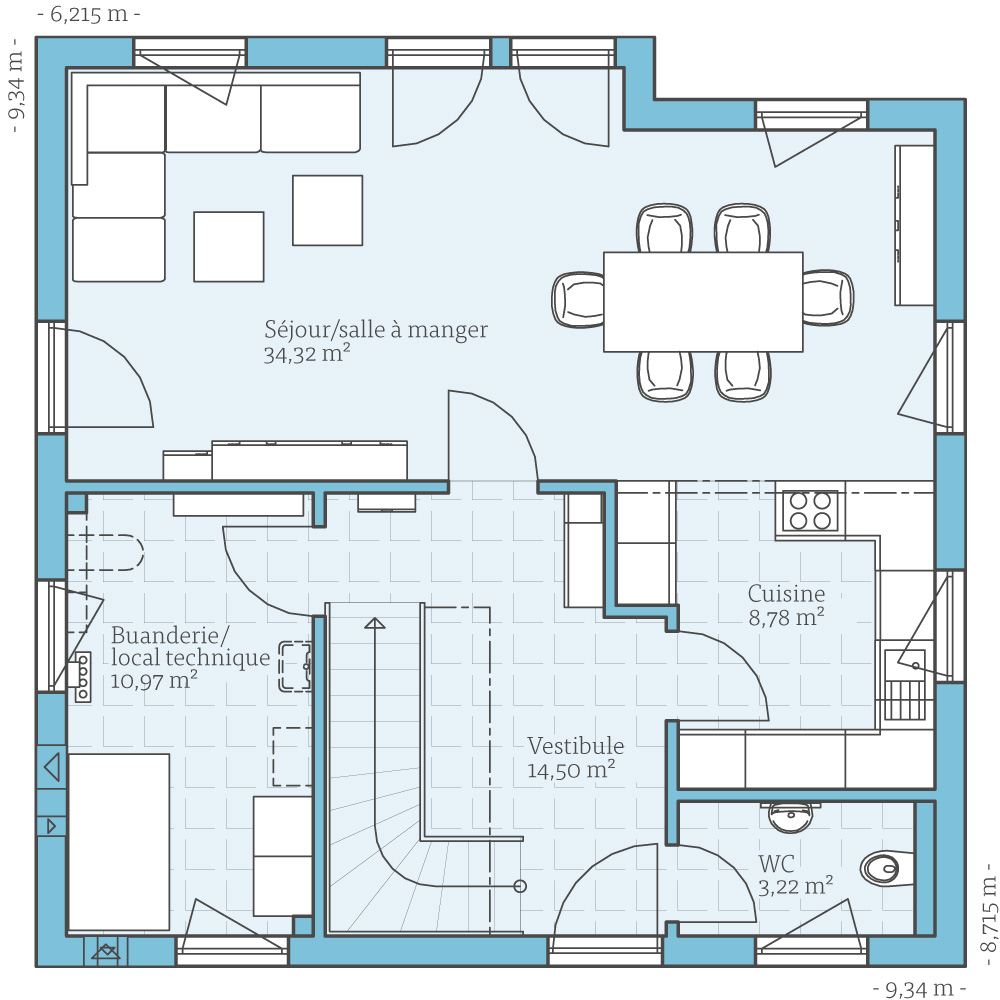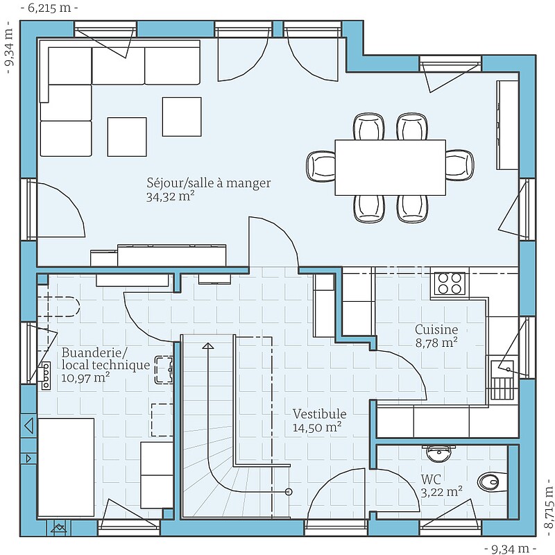 Il n'est pas toujours nécessaire de disposer d'un grand terrain pour réaliser ses propres représentations d'habitation. Avec une conception de maison comme celle du modèle Variant 45-130, même les petits espaces entre les bâtiments ou les terrains divisés peuvent être utilisés de manière optimale. Du fait de la conception ouverte du plan de niveau, le rez-de-chaussée en particulier semble considérablement plus grand, malgré sa taille compacte. Avec ce modèle, il n'est pas question de renoncer à une buanderie pratique et à des toilettes séparées pour les invités. Nous avons planifié la maison de manière à ce qu'elle puisse être construite à coûts réduits sur une dalle de fondation.