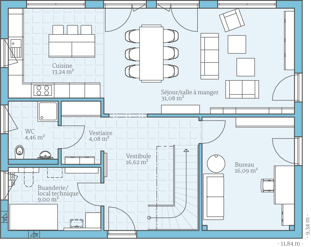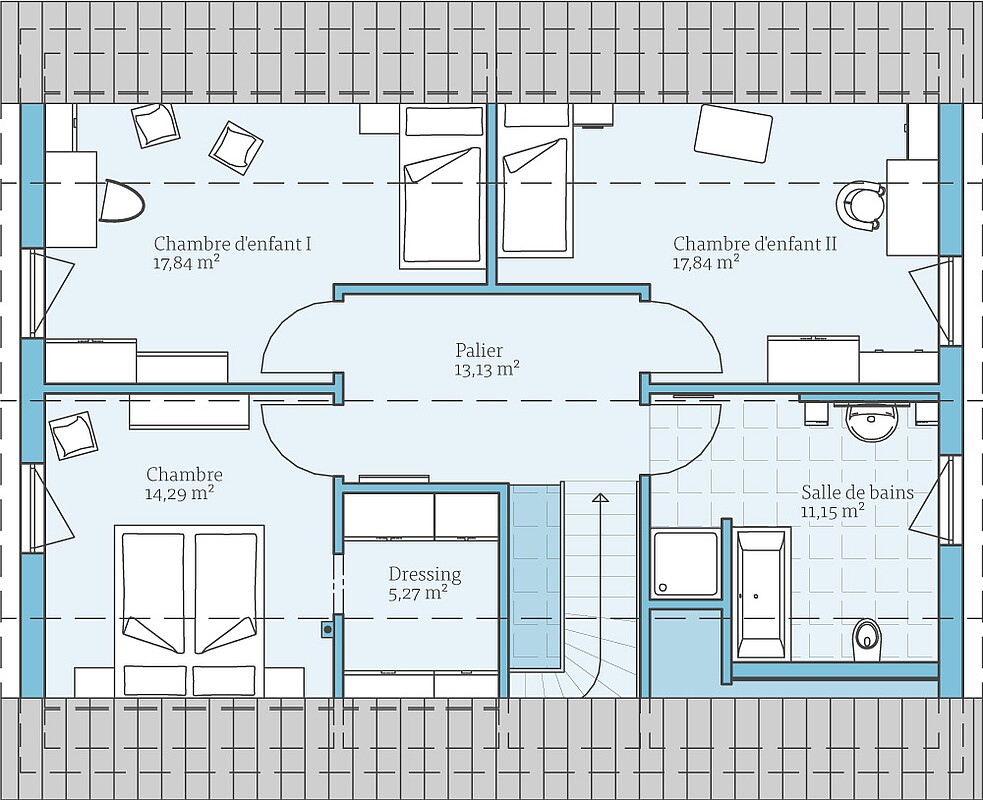 Ce modèle de plan peut être agrandi avec un pignon traversier pour ainsi créer ainsi une troisième chambre d'enfants.