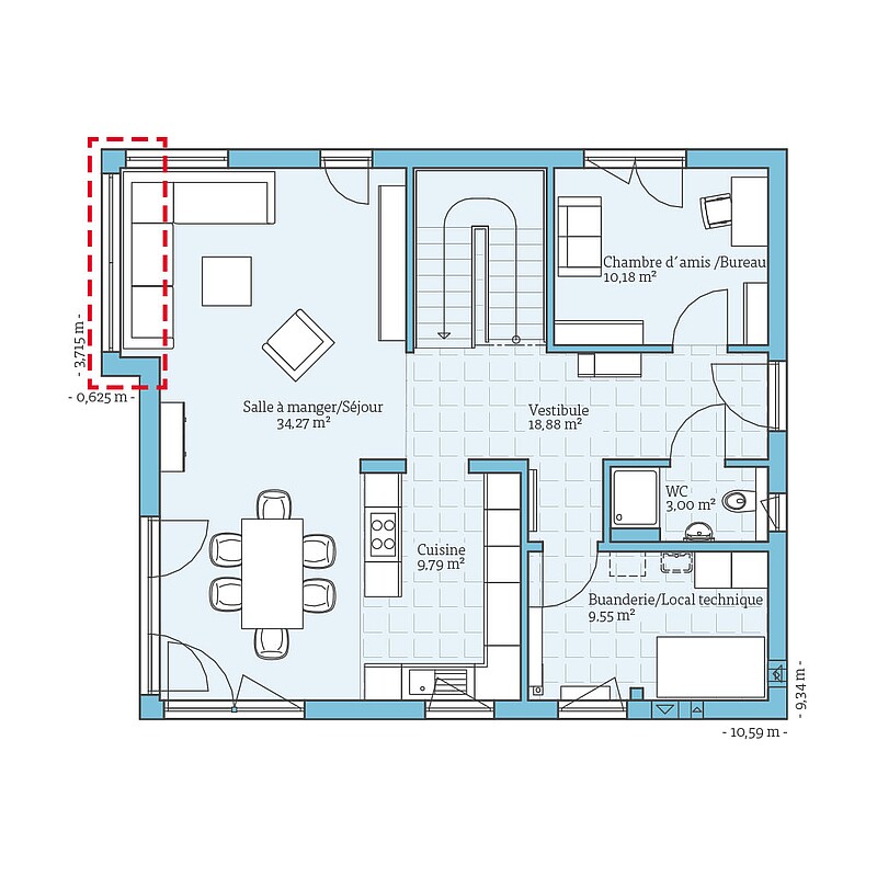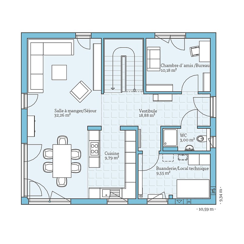 Logement spacieux sur deux étages complets: Bien que la surface de notre villa 166 soit inférieure d'environ 11 m² à celle de la villa 177/178, celle-ci offre suffisamment de surface pour une famille de quatre personnes. Le salon, la salle à manger et la cuisine sont disposés de la même manière que dans les deux plus grandes villas et sont baignés de lumière grâce aux éléments de fenêtre allant du sol au plafond.
