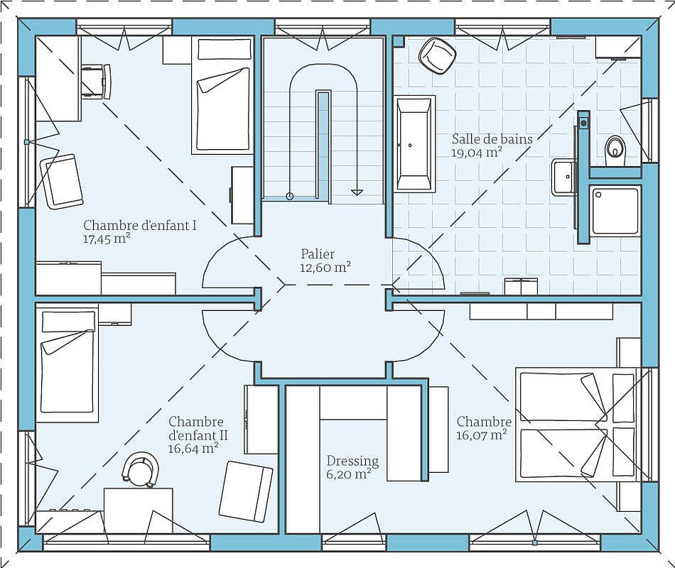 À l'étage, les changements apportés au plan de base ne sont que mineurs, car avec les deux grandes chambres d'enfants, la chambre principale avec dressing et la salle de bains extrêmement spacieuse, qui offre même de la place pour un sauna si vous le souhaitez, elle répond en l'état déjà aux souhaits les plus importants en matière d'habitat. Avec la maison d'exposition Villa 178 à Oberleichtersbach, nous montrons quelles sont les variantes disponibles en plus d'un sous-sol complet ou d'une dalle de fondation. Pour ceux qui ne souhaitent pas se lancer dans la construction d'un sous-sol complet, mais qui désirent tout de même pouvoir y cacher les installations techniques domestiques et un espace de stockage pour les provisions, un sous-sol partiel est une alternative rentable.