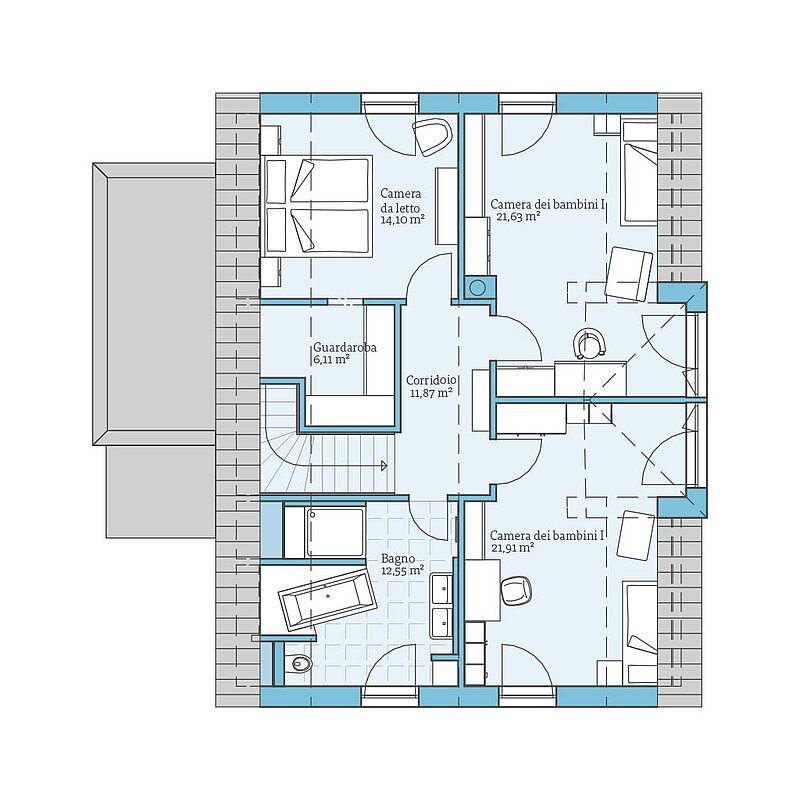 Nel sottotetto della casa con tetto a due spioventi ogni membro della famiglia trova il suo regno. Due ampie camere per bambini possono essere facilmente adattate all’evoluzione delle esigenze dei loro occupanti, e con il tempo si trasformano da camera per bambini a camera per adolescenti. Alla camera da letto matrimoniale si collega una cabina armadio che offre preziosi spazi ripostiglio. L’ampia sala da bagno con vasca e doccia a pavimento è un luogo meraviglioso per rilassarsi dopo una giornata stressante.