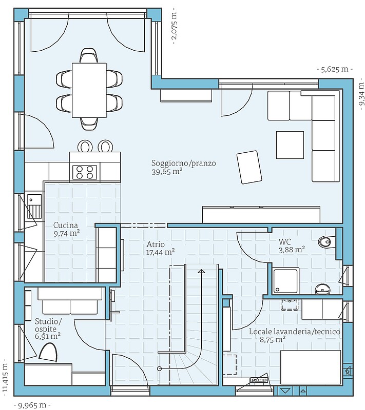 Il punto forte del progetto della planimetria della Variant 35-160 è la sua grande flessibilità. Per il piano terra sono disponibili due varianti di progettazione: la versione base con un piccolo studio e una stanza combinata di lavanderia/locale tecnico, e una versione opzionale in cui la casa viene ampliata con un garage e un locale tecnico. Qui, al piano terra, sono previsti un ufficio/camera per gli ospiti più grande e un piccolo locale lavanderia come chiusura dell'ingresso laterale coperto. Inoltre una spaziosa cucina.