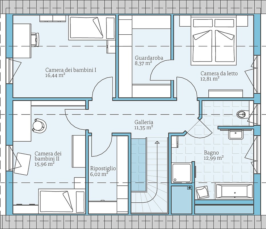 La luminosa zona pranzo della casa Variant 35-173 è il centro della vita quotidiana della famiglia. Collega la zona giorno con la cucina aperta. La spaziosa cucina invita a lavorare e cucinare insieme, una dispensa offre ampio spazio per lo stoccaggio e sostituisce gli armadietti alti. Nel bagno degli ospiti, adiacente alla camera degli ospiti/studio, c'è spazio per una doccia. Nella mansarda, le due camere da letto dei bambini, la camera da letto principale e il bagno sono situati sul lato frontone, essendo questo lato molto luminoso. Lo spazio sotto il tetto spiovente è utilizzato in modo ottimale per la scala e lo spogliatoio adiacente alla camera da letto. C'è anche abbastanza spazio per un ulteriore ripostiglio, che può essere utilizzato come lavanderia. Nel bagno di famiglia, la toilette è nascosta dietro un muro e la vasca da bagno è posta sotto il tetto spiovente per risparmiare spazio.