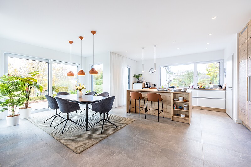 Particolarmente pratico: In un locale aggiuntivo che si collega direttamente alla cucina aperta, è progettata una combinazione di dispensa e lavanderia. In questo modo si possono ridurre le distanze da percorrere in casa.