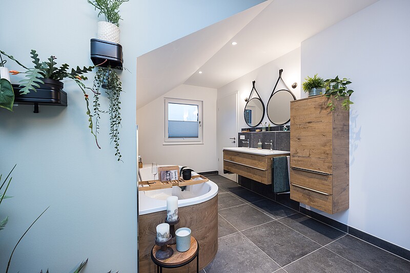 Anche l’opzionale abbaino a parete rende questo progetto di casa un talento versatile pianificabile con flessibilità: L’ampio bagno padronale nel sottotetto e una delle due spaziose camere per bambini vengono ampliate non solo di 1,5 metri quadrati, ma hanno anche una porzione extra di luce naturale.