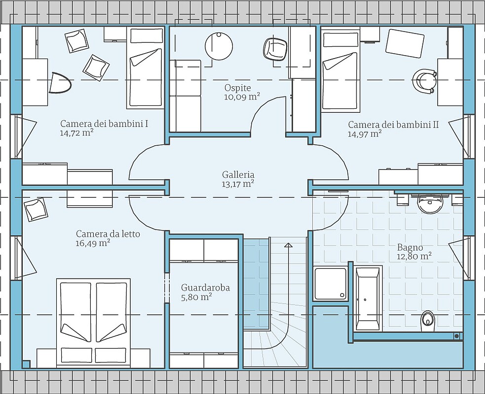- Con il timpano opzionale si estende il piano terra di quasi 5 m². La camera degli ospiti può essere utilizzata anche come terza camera dei bambini grazie al timpano, perché guadagna spazio ed è luminosa e inondata di luce grazie al fronte della finestra.