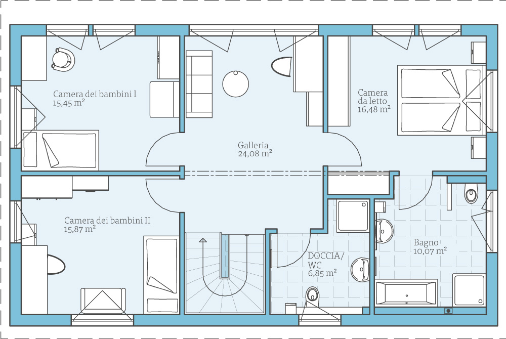 Il progetto più grande della serie “Vita”, con tetto a due falde, offre una meravigliosa quantità di spazio per implementare le idee abitative. Oltre al luminoso soggiorno, alla sala da pranzo e alla cucina, a un ripostiglio e al bagno di servizio, c'è anche un locale al piano terra che può essere utilizzato come camera degli ospiti o studio. C'è anche uno spazio al piano superiore per lavorare da casa: la grande galleria può essere perfettamente progettata come una luminosa area lavoro.